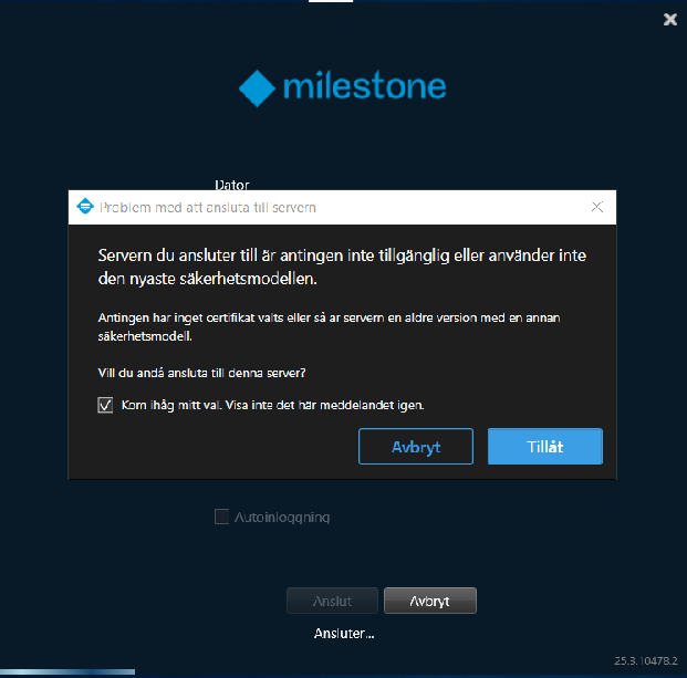 Efter inloggning kryssa i rutan ”kom ihåg mitt val. Visa inte det här meddelandet igen” Bekräfta genom att klicka tillåt